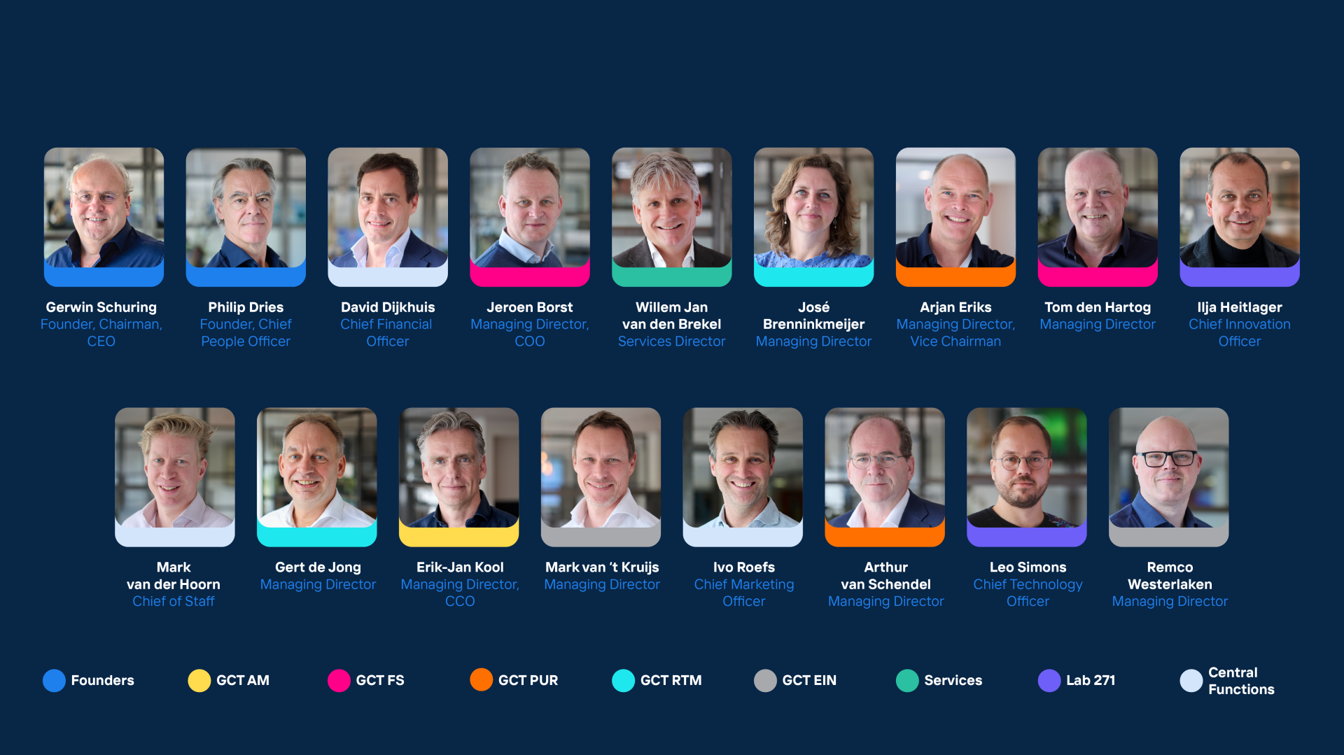 The Board comprises of three executive directors and four non-executive directors. The three executive directors are Gerwin Schuring (CEO), Philip Dries (CPO), and David Dijkhuis (CFO), acting on behalf of the Council and are responsible for the day-to-day operations of Schuberg Philis. The four non-executive directors bring strategic oversight, objective insight, and diverse experience from several industries. Together, they help guide our growth trajectory, both in the Netherlands and internationally without changing how we work day to day.